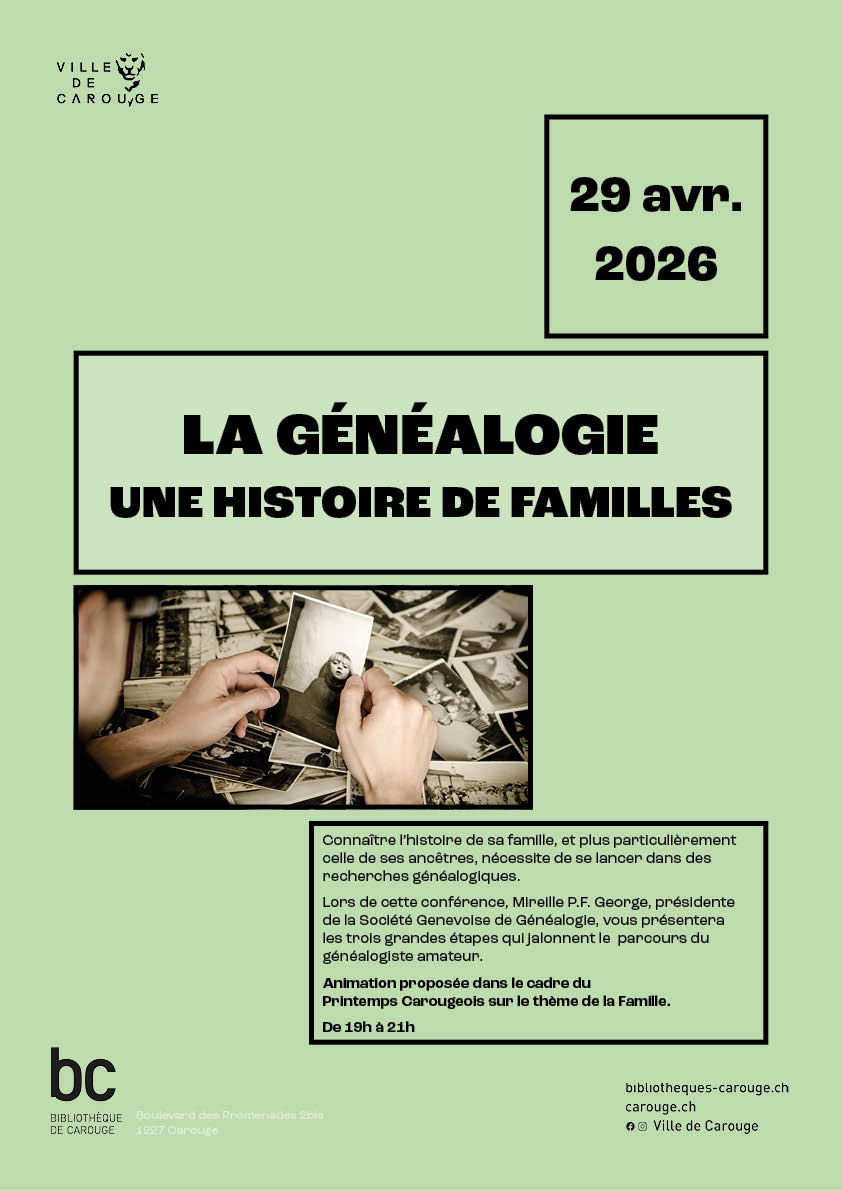 La Bibliothèque de Carouge vous invite à plonger dans votre histoire familiale avec la conférence La Généalogie: une histoire de familles, donnée par Mireille P. F. George, carougeoise et présidente de la Société genevoise de généalogie (SGG).